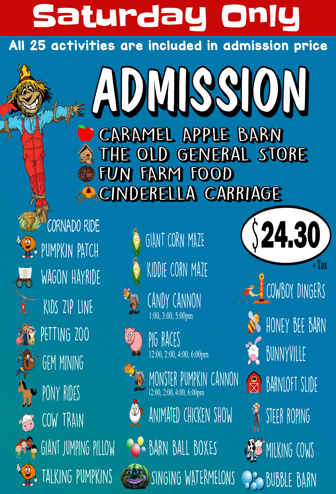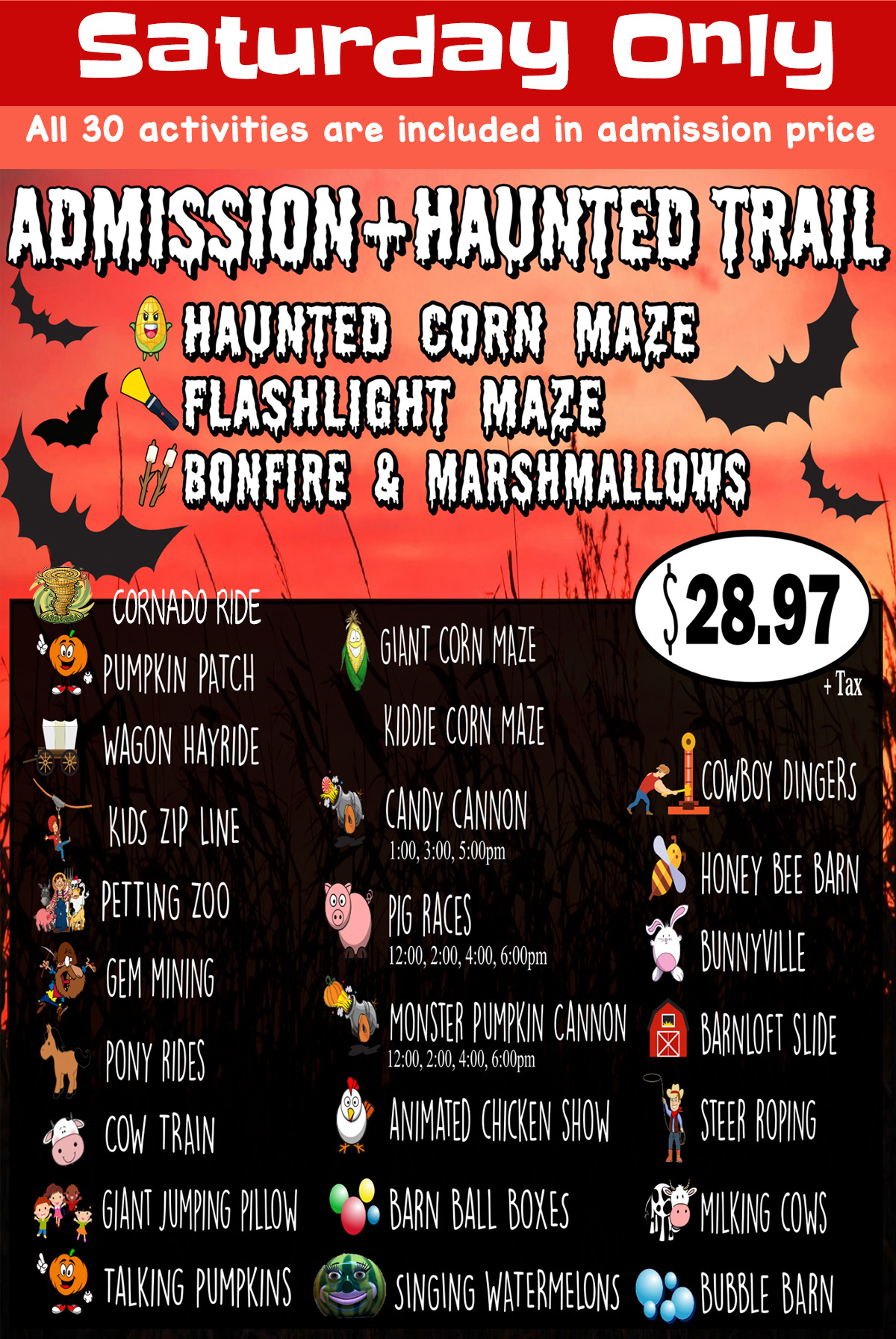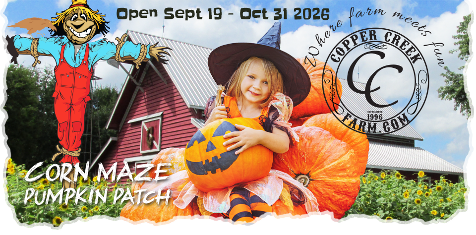 A day at Copper Creek Farm is packed full of excitement, adventure, and making memories. Activities may include: Pumpkin Patch, Haunted Maze, Corn Maze, Cow Train, Gem Mining, Hayride, Pig Races, Animated Chicken Show, Barn Loft Slide, Corn Box, Sunflower Box, Pony Maze, Bunnyville, Talking Pumpkins, Bubble Barn, Giant Jumping Pillow, Milking Cow, Pony Rides, Petting Barn, Steer Roping, Bunny Bee, Barn, Monster Pumpkin & Watermelon Cannon, Music and so much more!