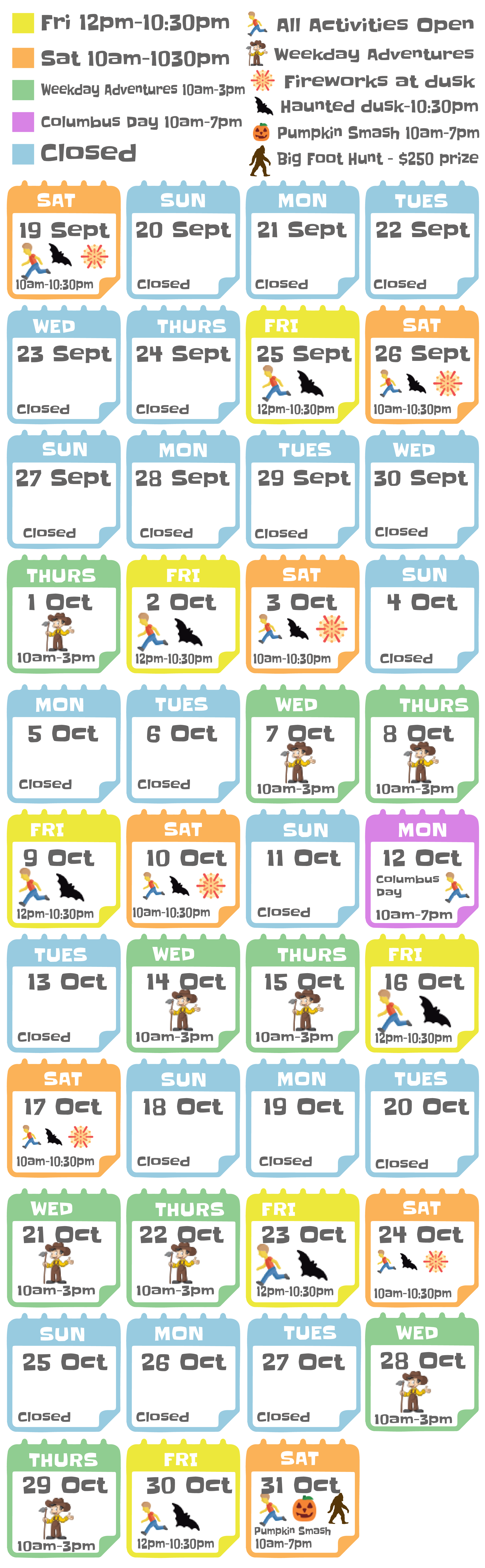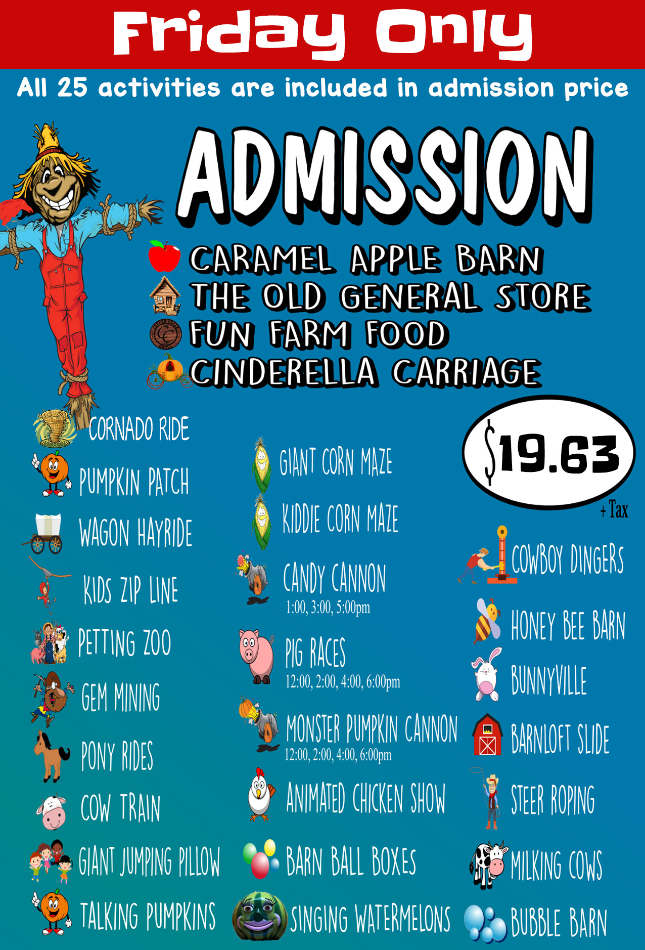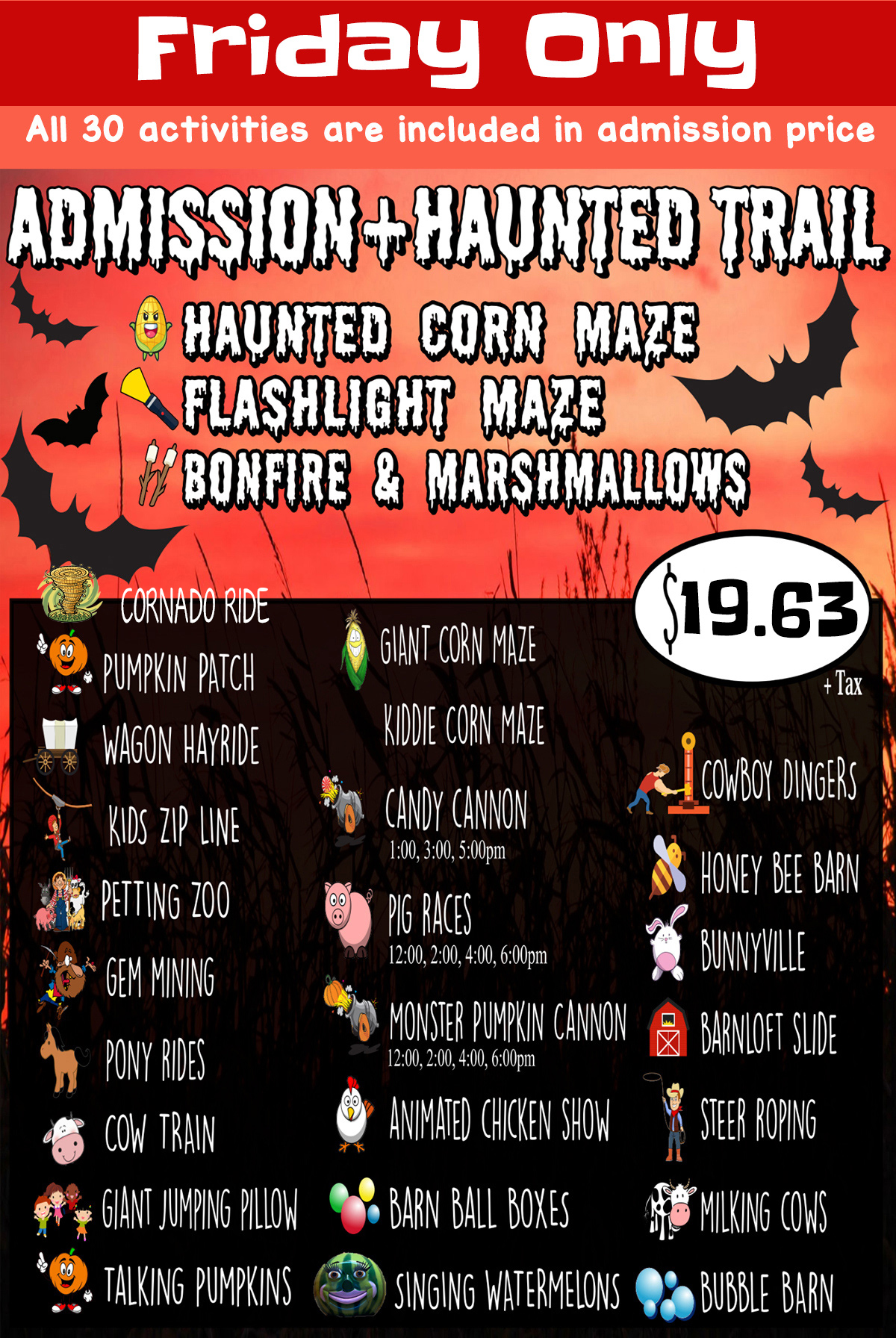 A day at Copper Creek Farm is packed full of excitement, adventure, and making memories. Activities may include: Pumpkin Patch, Haunted Maze, Corn Maze, Cow Train, Gem Mining, Hayride, Pig Races, Animated Chicken Show, Barn Loft Slide, Corn Box, Sunflower Box, Pony Maze, Bunnyville, Talking Pumpkins, Bubble Barn, Giant Jumping Pillow, Milking Cow, Pony Rides, Petting Barn, Steer Roping, Bunny Bee, Barn, Monster Pumpkin & Watermelon Cannon, Music and so much more!